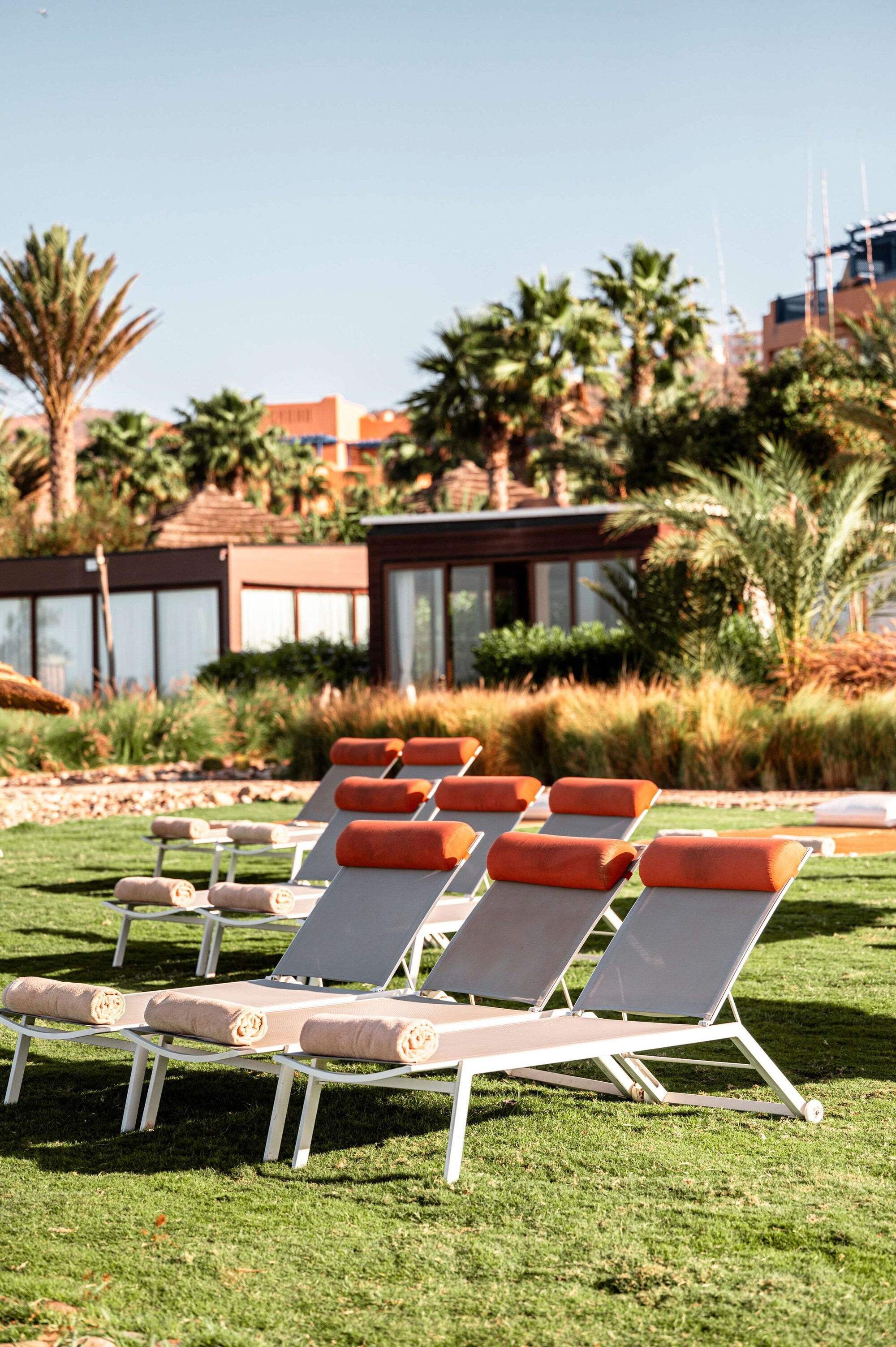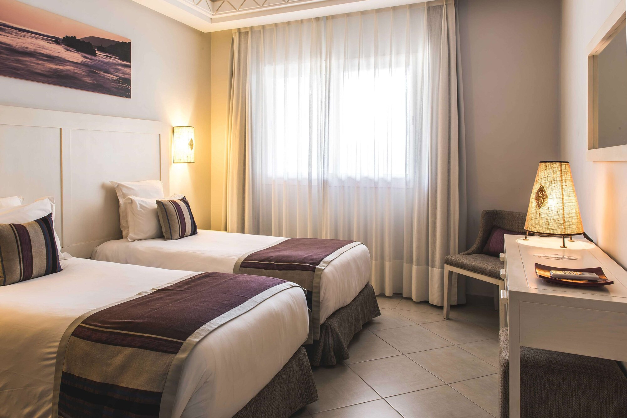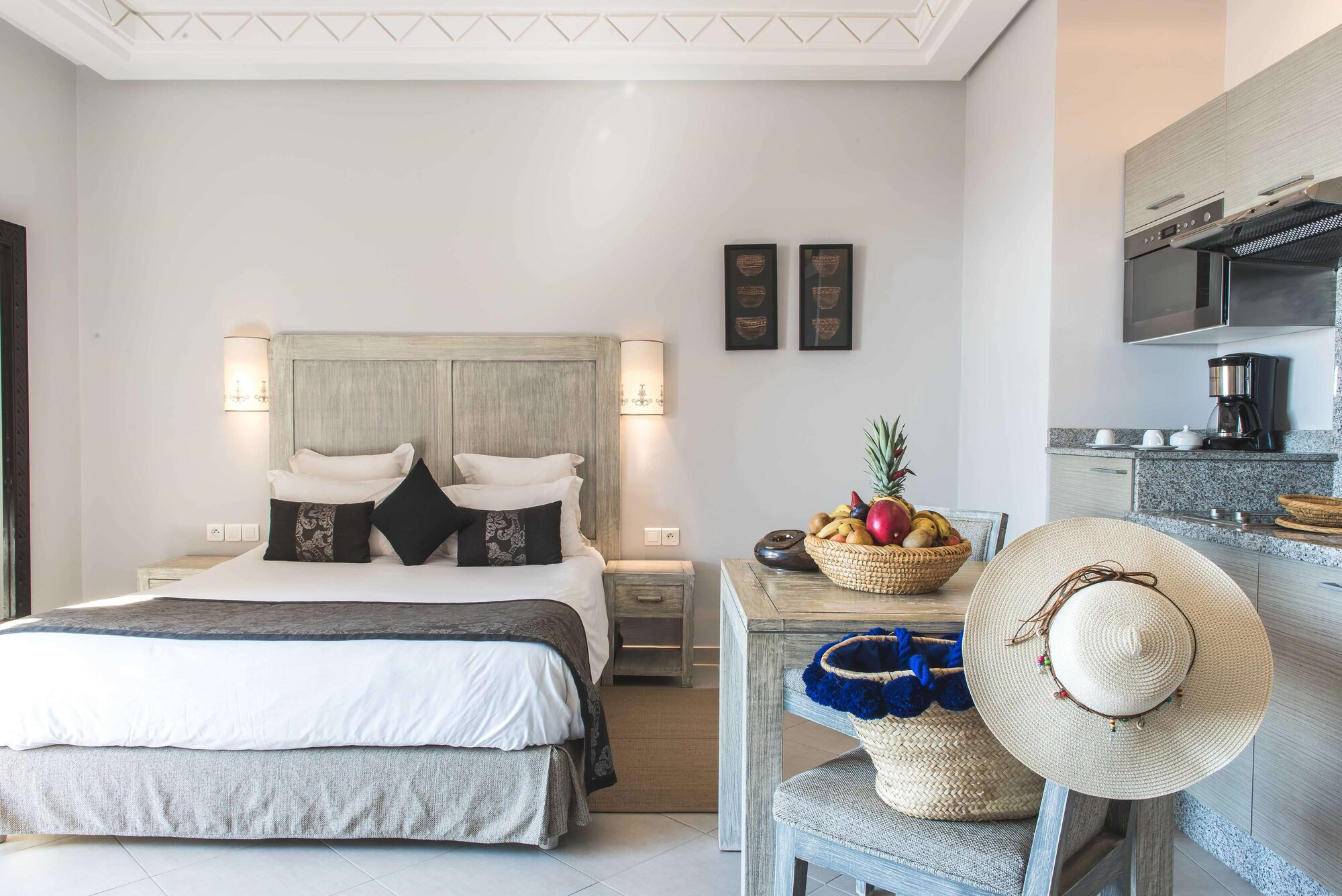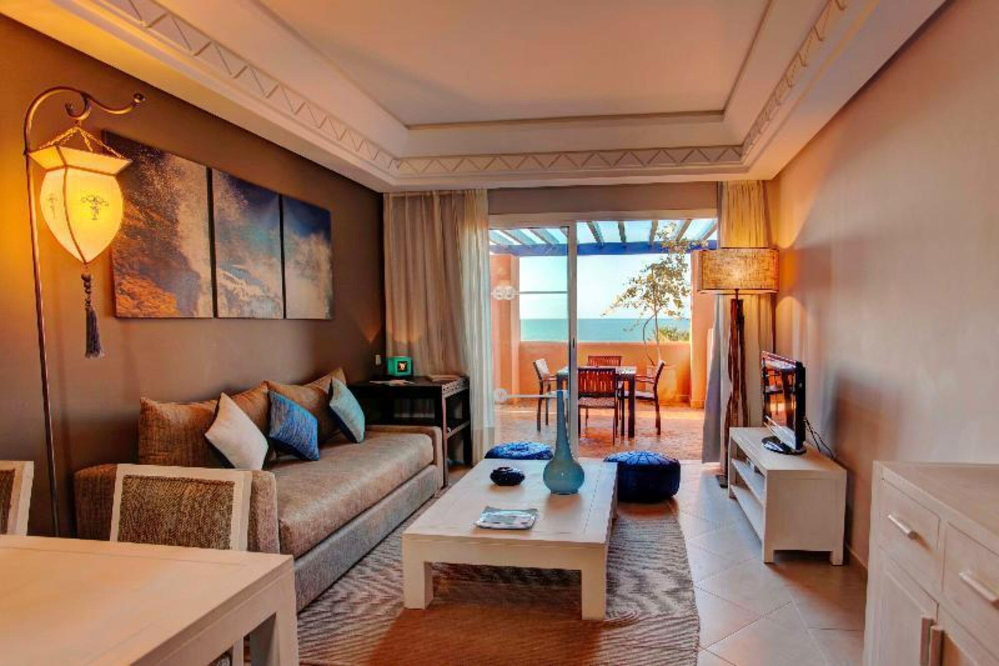 Os quartos de hóspedes estão sumptuosamente decorados, apresentando um design contemporâneo com influências marroquinas.